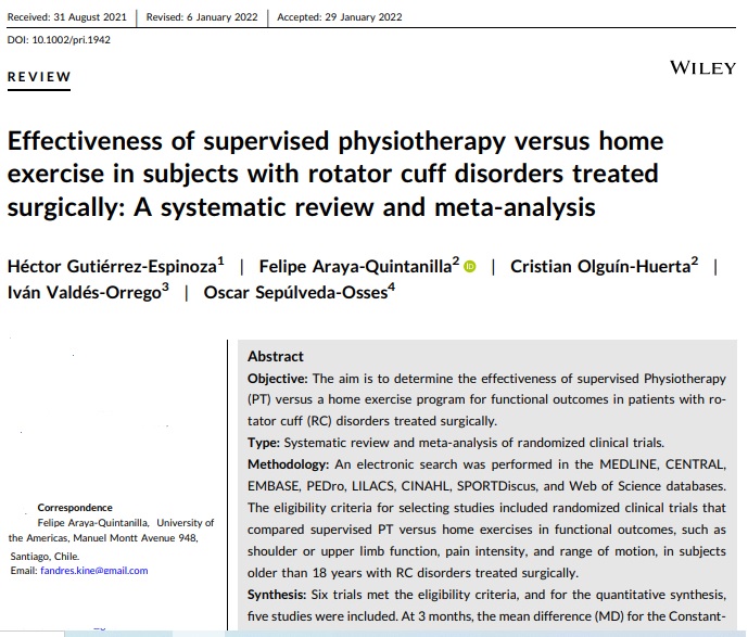 Effectiveness of supervised physiotherapy versus home exercise in subjects with rotator cuff disorders treated surgically: A systematic review and meta-analysis